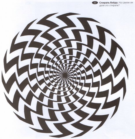 | Иллюзия вращающейся спирали Эта оптическая иллюзия обладает двойным эффектом. Во-первых, если просто смотреть на картинку расфокусировав взгляд, то спираль совершает какие-то странные движения. Если же вы, глядя в центр будете двигать головой вперёд-назад, то движения примут вращательный характер. На самом же деле эта картинка статична. Второй эффект обмана зрения заключается в том, что эта «спираль» на самом деле вовсе не спираль, а два кольца с общим центром :о)